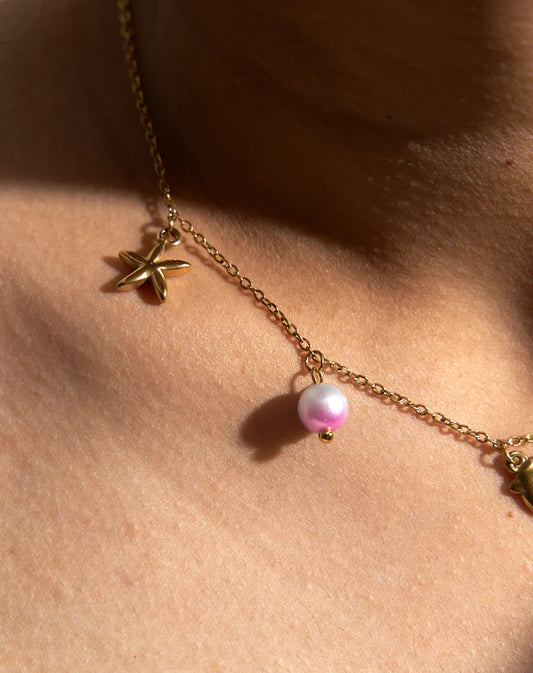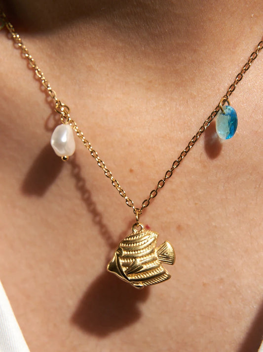49% OFF18K GOLD PLATED BEACH VIBES CHARMS - FISH PEARL CHAIN NECKLACE