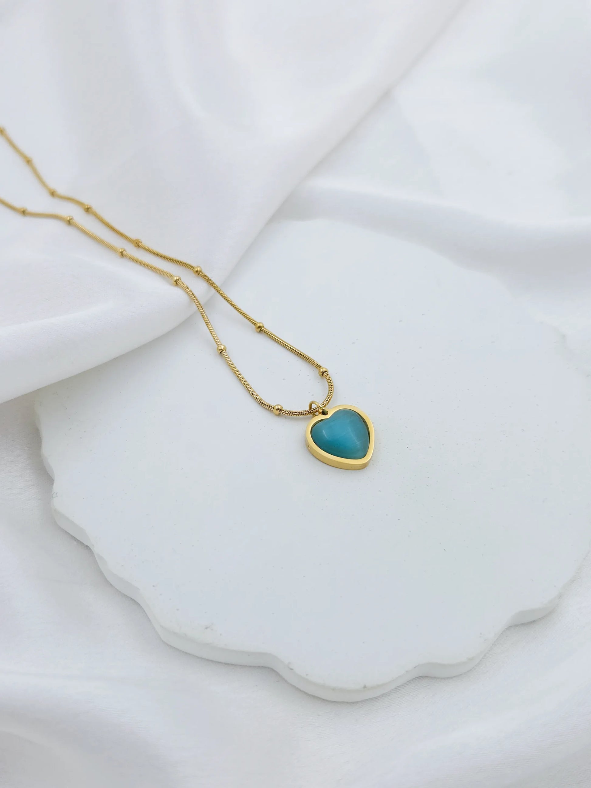 Beaded Chain Blue Heart Pendant Necklace - 18k Gold Plated